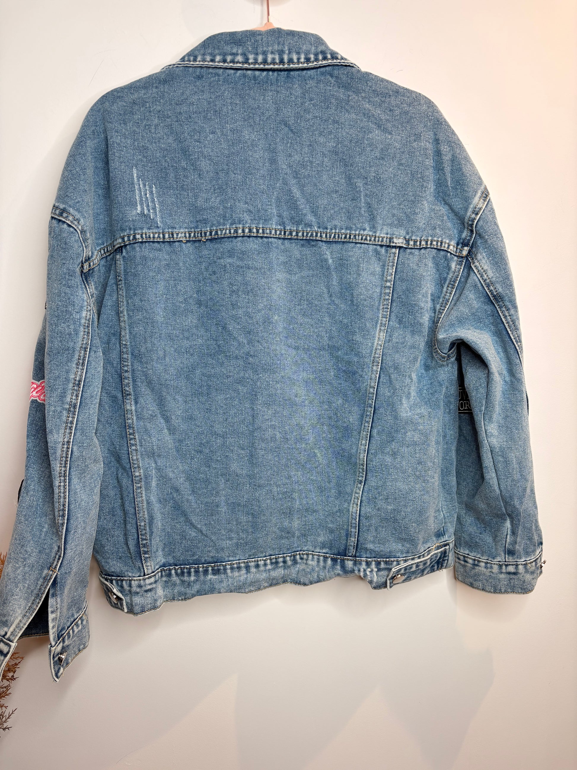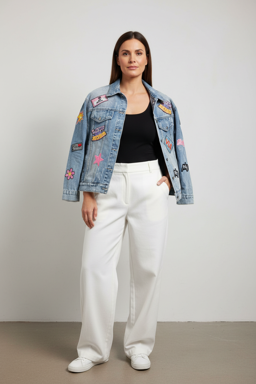 Son denim intemporel est dynamisé par des patches brodés esprit pop et urbain, pour un look moderne, affirmé et plein de personnalité.