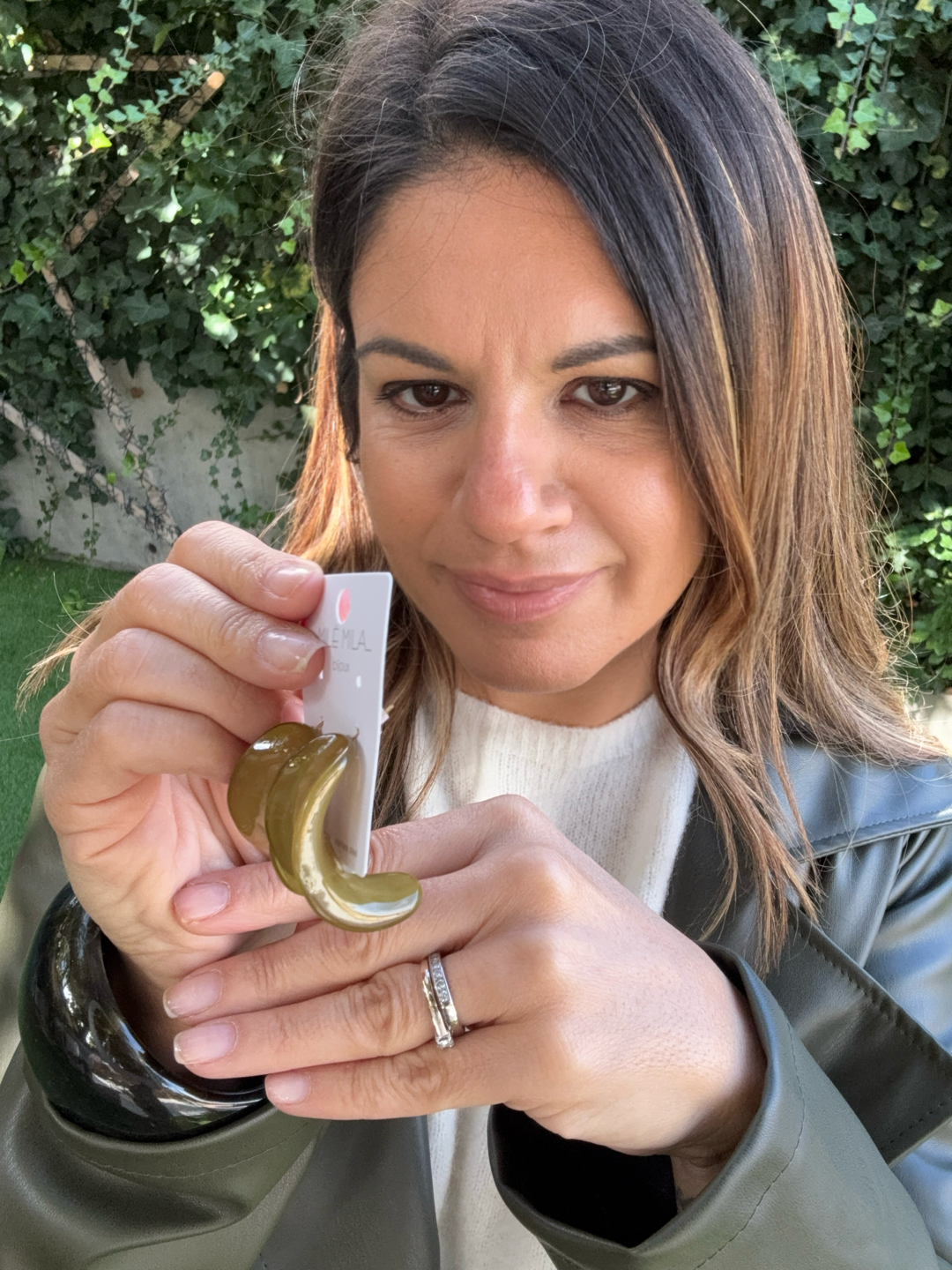 Craquez pour ces boucles d’oreilles femme tendance en résine kaki, au design moderne et graphique.