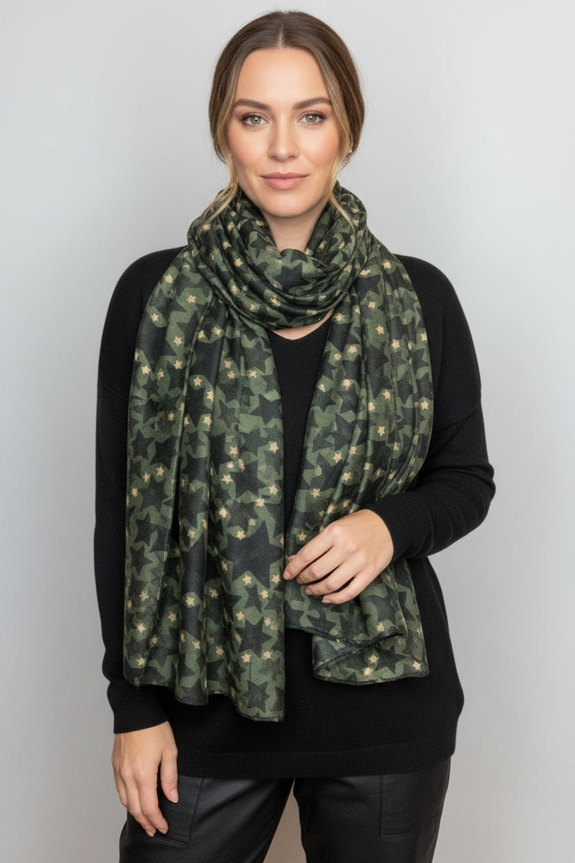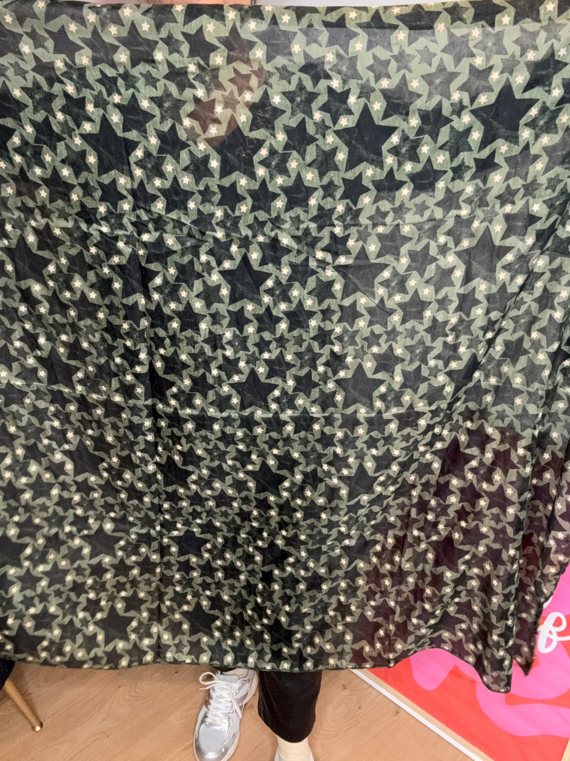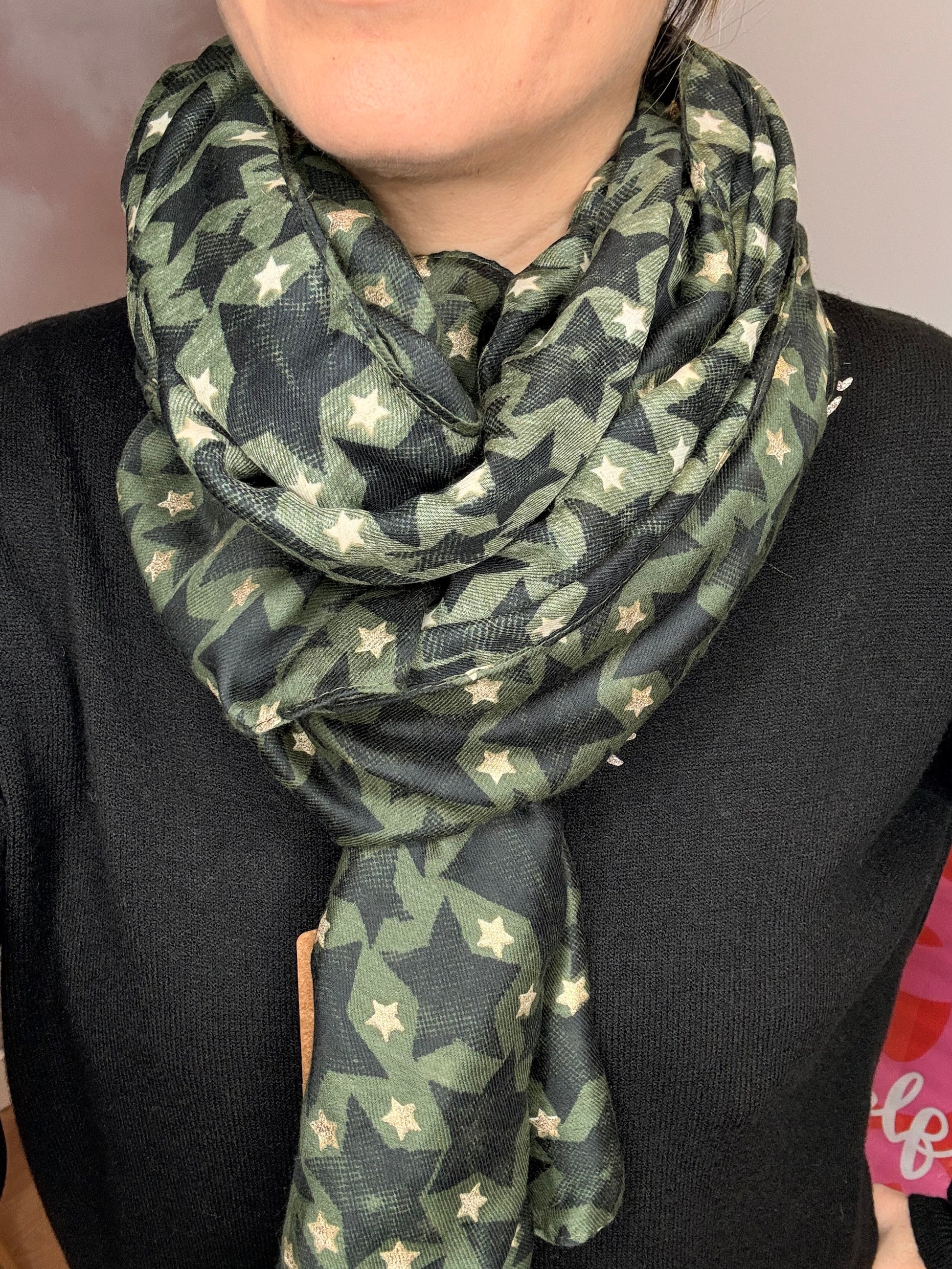 On adore réchauffer tes looks avec des pièces qui ont du caractère ! Notre écharpe douce femme coloris kaki à motif étoiles est ton nouvel allié pour affronter le froid avec style. Ultra-moelleuse, elle t’enveloppe comme un câlin XXL, et ses étoiles apportent ce twist graphique qui fait toute la différence.