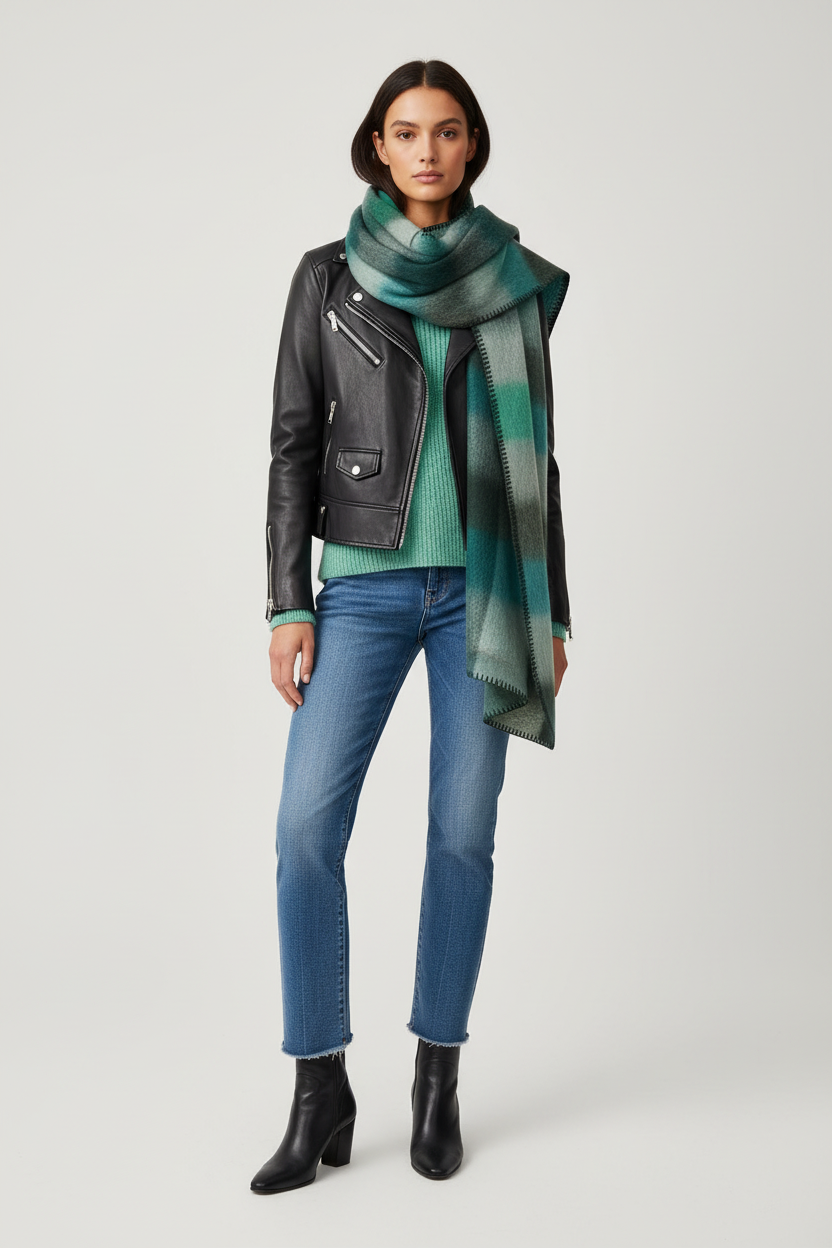 À porter avec un manteau beige, gris ou noir, un pull uni et un jean pour un look féminin, moderne et chaleureux.