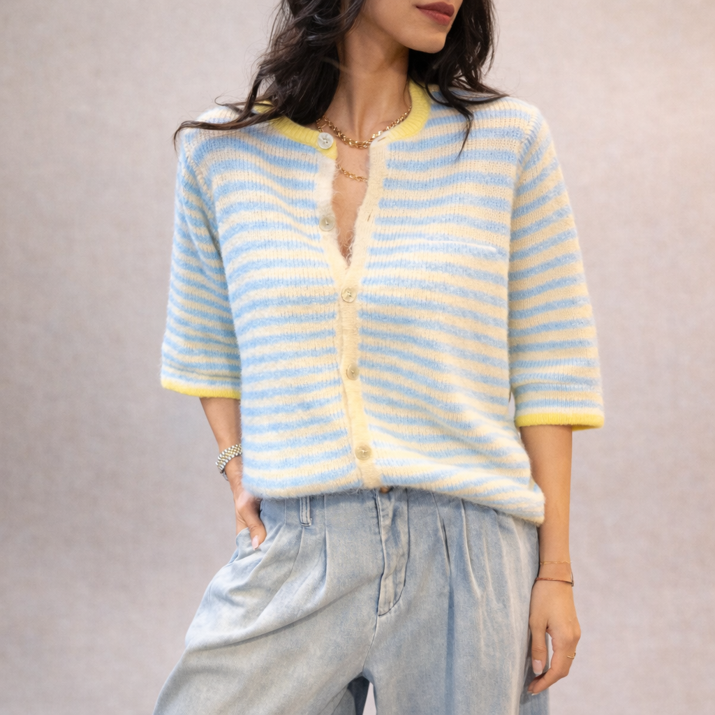 Ce gilet signé Johanna Paris est la pièce parfaite pour un look féminin, moderne et confortable. Ses rayures pastel bleu et jaune apportent douceur et fraîcheur, idéales pour la mi-saison.