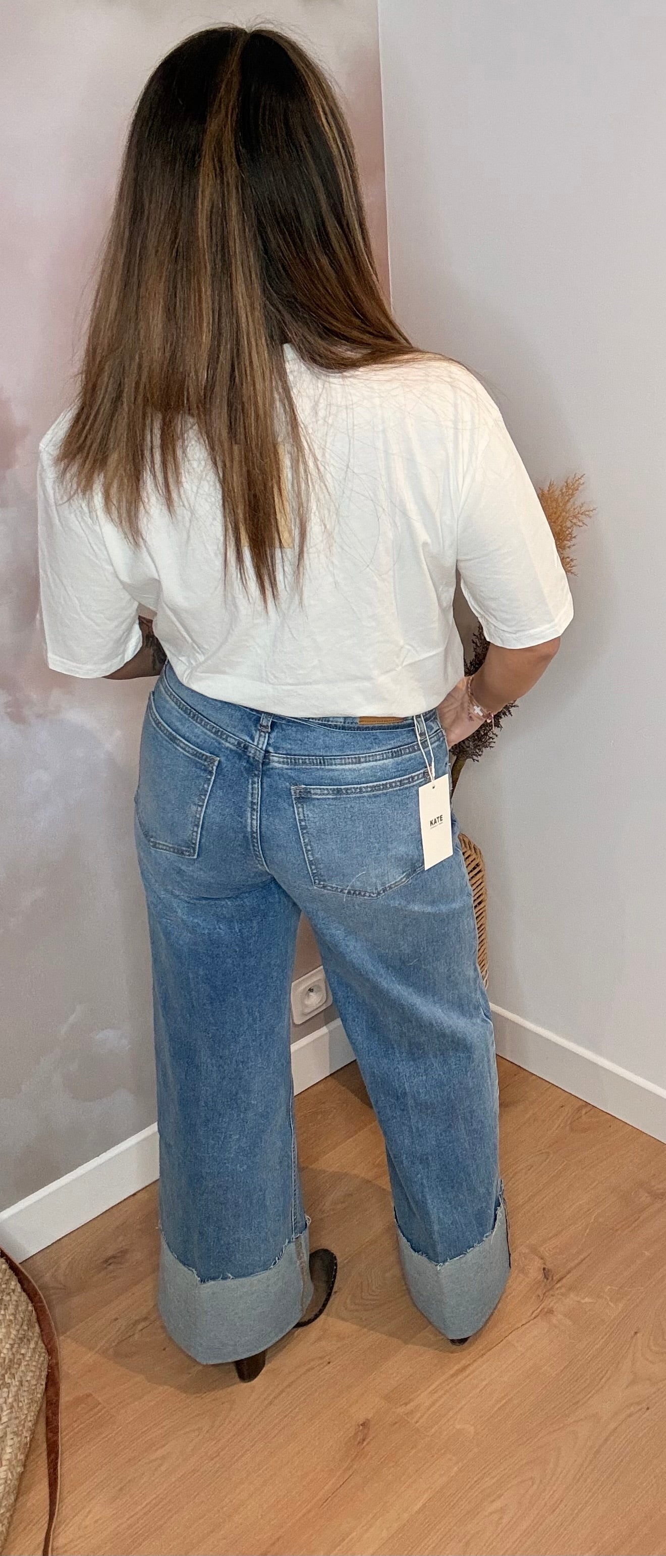Ce jean large à revers est la pièce parfaite pour un look moderne, décontracté et féminin.