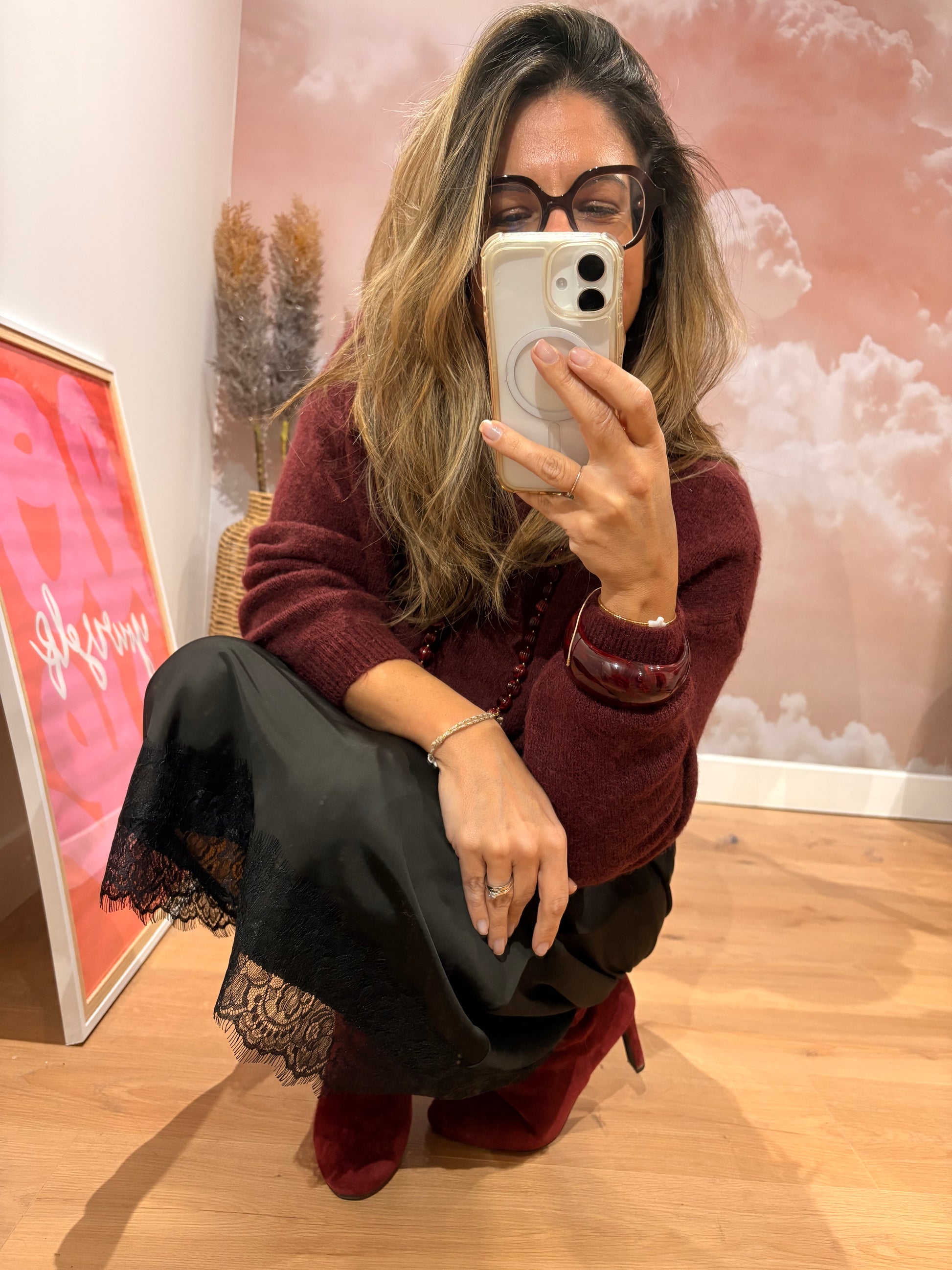 Élégante, raffinée et féminine, la jupe longue Johanna Paris séduit par son tombé fluide et sa délicate finition en dentelle noire. Sa coupe longue sublime toutes les silhouettes et apporte une élégance intemporelle à vos looks, que ce soit pour une soirée, un brunch ou une journée chic en ville.