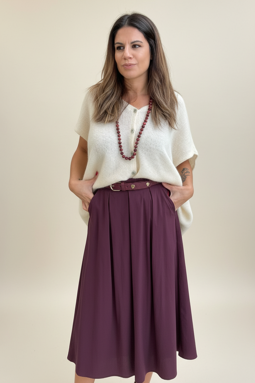 Le prune Johanna Paris apporte une touche chic et chaleureuse, facile à associer et parfaite pour un look mode et affirmé. Cette jupe longue devient votre alliée de saison pour un style tendance et confortable.