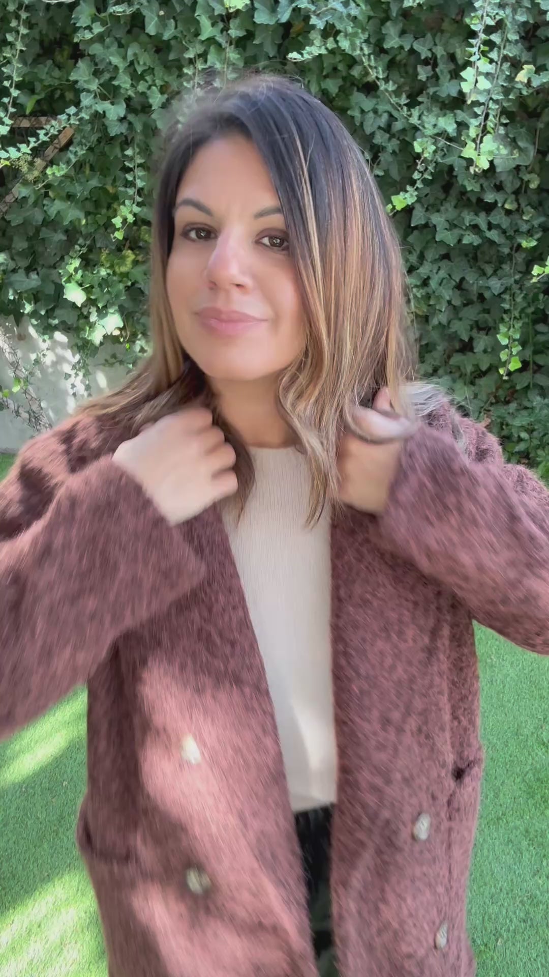 Détails : double boutonnage, poches latérales, texture bouclée ultra douce