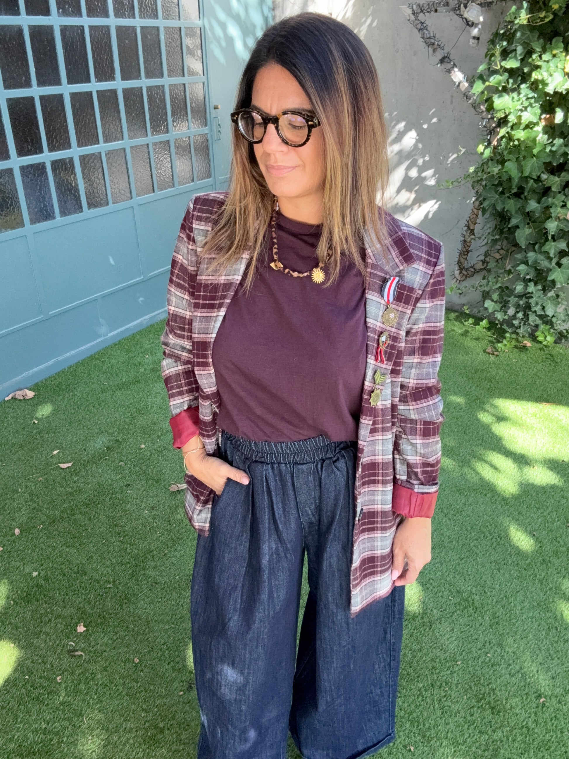 Repéré sur Insta ➡ repéré sur vous ✨. Ce blazer à carreaux bordeaux & gris, c’est LA pièce qui donne du style en 2 secondes chrono. Coupe droite canon, petit côté loose qu’on adore, et surtout… ces détails médailles qui font toute la diff’.