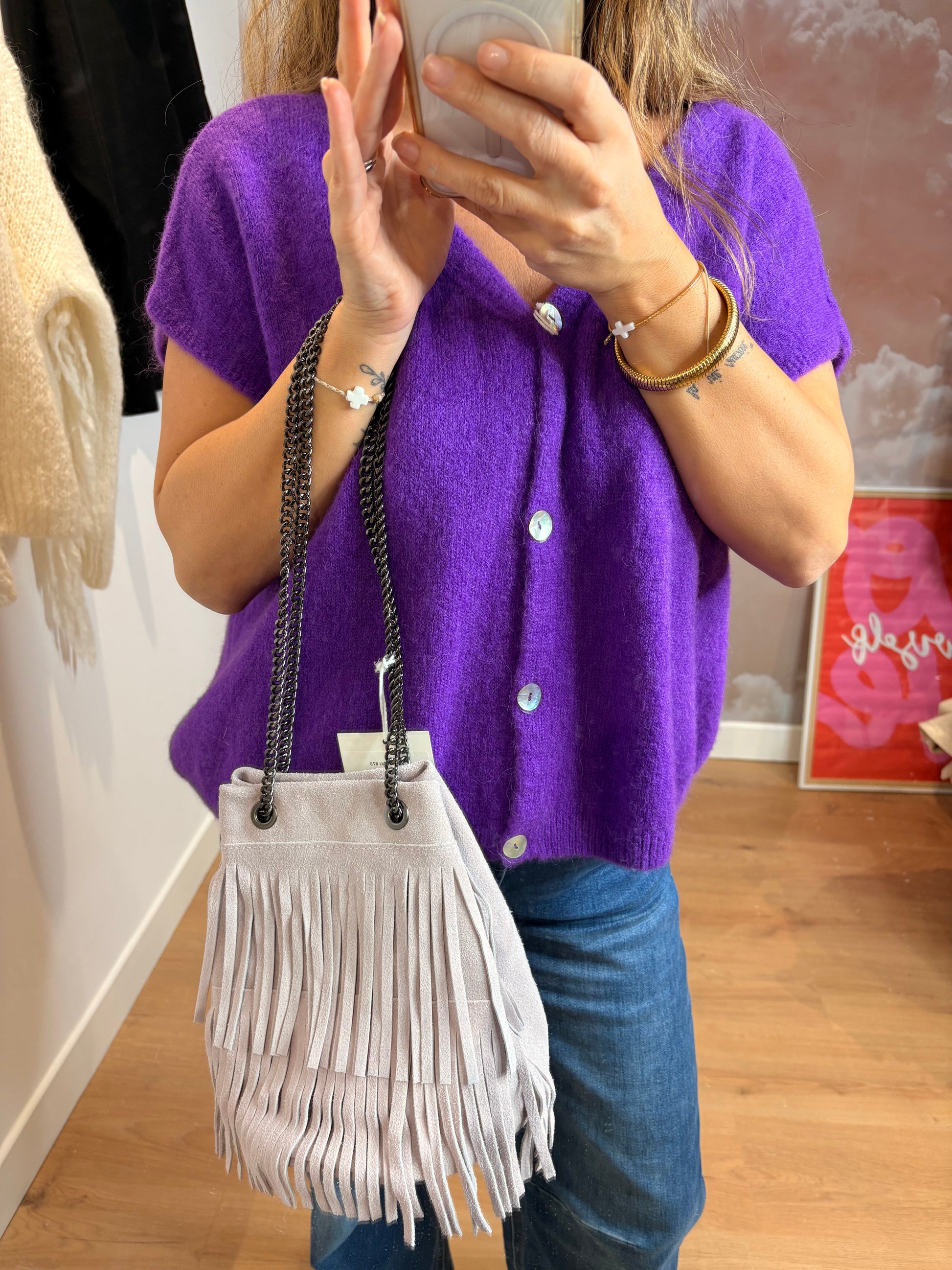 Impossible de passer à côté : ce sac seau à franges lilas Ninou a ce petit truc en plus qui booste instantanément n’importe quelle tenue. Son cuir en vachette souple, sa forme seau ultra pratique et ces franges qui bougent avec toi… c’est LA touche mode qui fait la différence sans en faire trop.
